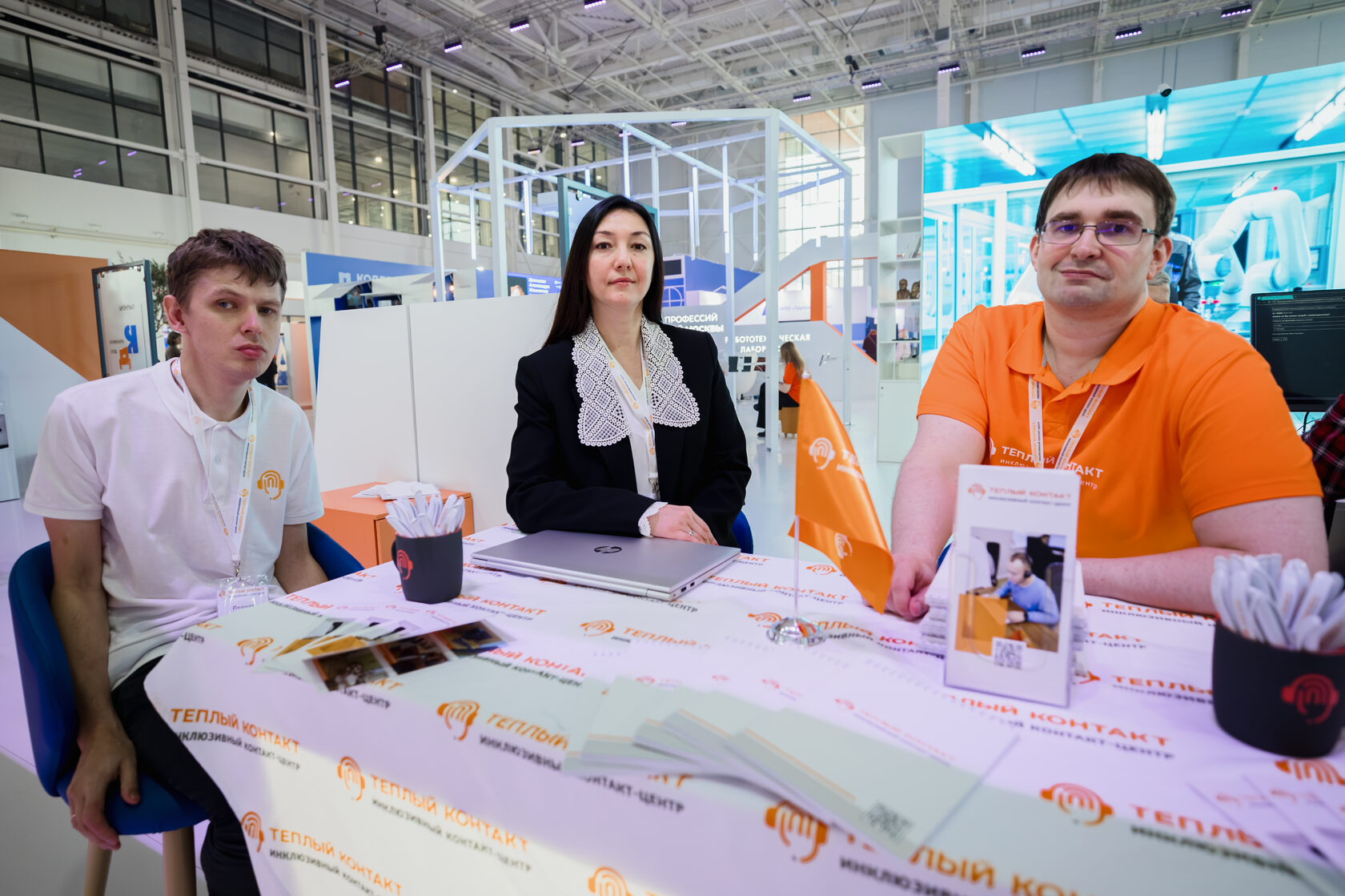 На выставке наш центр занимал довольно большое пространство, где был представлен рабочий процесс в миниатюре. Два оператора: Анастасия Парфёнова и Денис Могальков, показывали процесс работы оператора инклюзивного контактного центра, в том числе с применением дисплея Брайля , специалист по обучению и адаптации Анатолий Терёшкин показывал процесс обучения новых операторов, а старший администратор Станислав Богданов и главный специалист по кадрам Ирина Бышкова рассказывали о нас и провели даже несколько реальных собеседований. В выставке принял участие и ассистент менеджера проектов Павел Леонов, который представлял наш Центр в деловой программе и собрал большой материал о мероприятиях за все четыре дня.